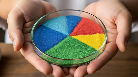 Hands Holding Petri Dish with Colorful Sand Segmented Pie Chart