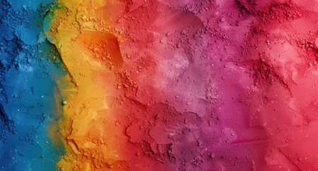 A close-up, macro view of vibrant powders arranged in diagonal stripes forming a rainbow of colors. The textured pigments create a bright, cheerful, and abstract background, often associated with celebrations like the Holi festival.