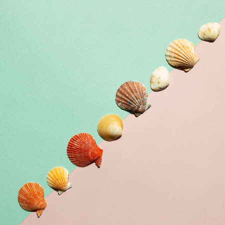 Seashell on pink and green background. summer marine decoration. flat lay, top view, copy space