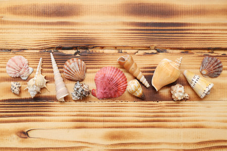 Many different sea shells on wooden background