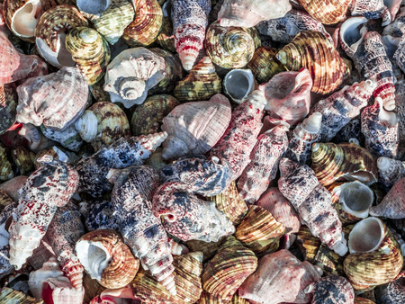 background with colorful sea shells of mollusks, close up.
