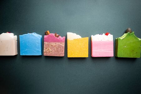 Craft natural cosmetic. A group of multicolored handmade soap. Top view.