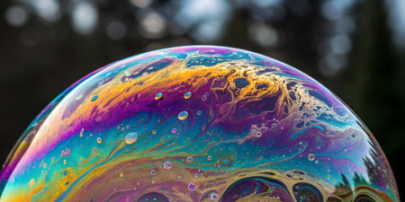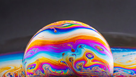 Macro photo of a soap bubble with striking colors and a planet-like appearance, selective focus