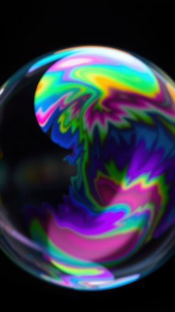 A macro shot of a soap bubble with a bright colorful surface isolated on a black background