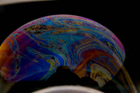 close up picture of half soap bubble on black background look like liquid planet in space