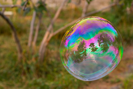 Coloured translucent soap bubble floating outdoors in the air on sunny evening with trees and sky in the background. Nature background with soap bubbles closeup. Soft dreamy image.