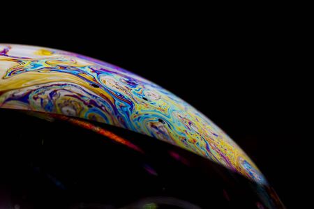 Blurred colourful soap bubble close up on black background. Creative background. Concept of space and creativity. Imitation of an unknown planet.