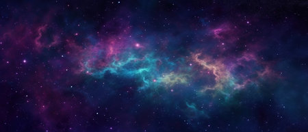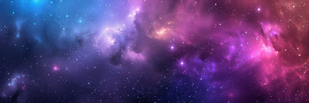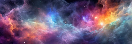 Space Nebula banner. Fantastic colorful starry outer space with multicolored gas clouds. Generative AI.
