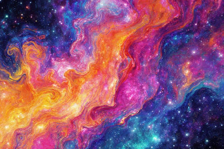 This image showcases a vibrant and textured representation of space, complete with a mix of cosmic colors, and scattered stars. The application of a technique similar to watercolor painting results in a dynamic and visually engaging portrayal of a night sky.