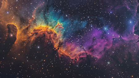 A colorful space scene with a mix of purple, blue, yellow, and orange clouds. Concept of wonder and awesome at the vastness and beauty of the universe