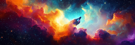 A dynamic and radiant scene of a spaceship navigating through a colorful nebula, surrounded by swirling stardust and glowing cosmic particles, full of mystery, banner