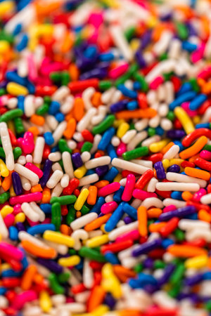 Close-up texture Sugar candy, small colorful, sweet food, for sprinkles, donuts, and cakes in birthday celebrations. macro background