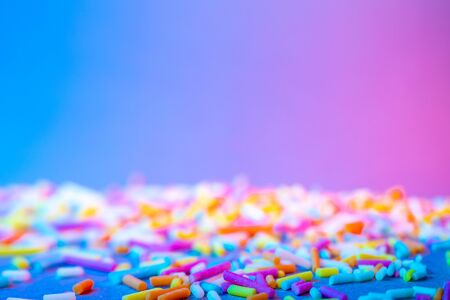 colored sweet sprinkles closeup on blue background
