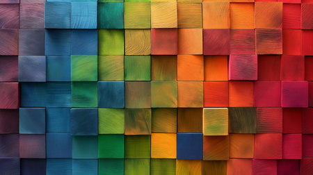 Vibrant wooden squares in various colors are meticulously organized in a grid. Each square showcases unique wood grain textures, creating an eye-catching display perfect for design inspiration.