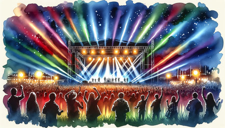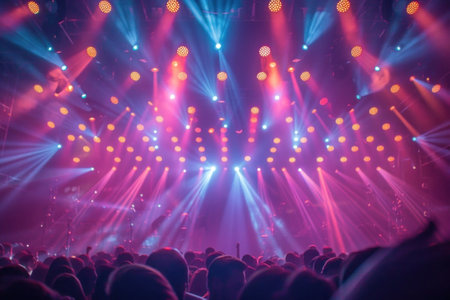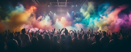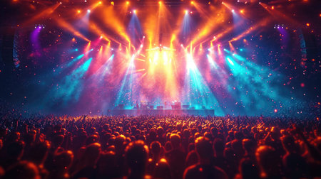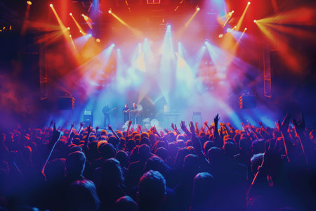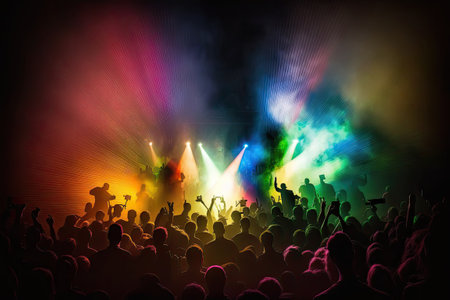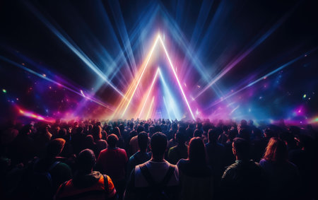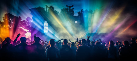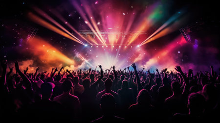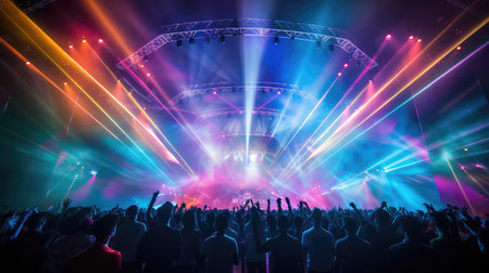 Stage lights and crowd of audience with hands raised at a music festival. Fans enjoying the party vibes.