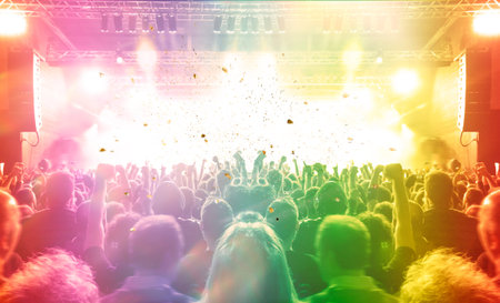 Music festival crowd,concert spectators in front of a bright stage with live music