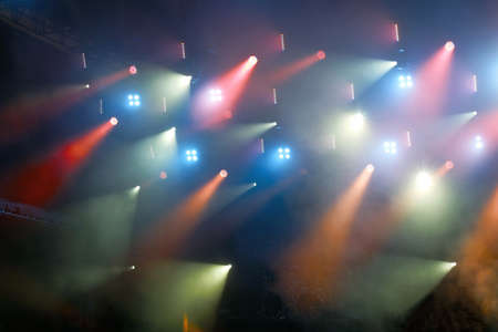 Stage lights on concert. Lighting equipment with multicolored beams.