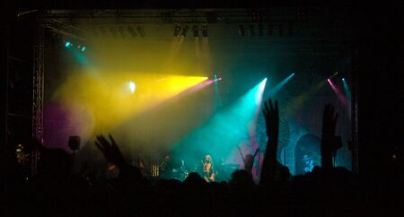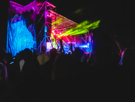 Abstract blur atmosphere: happy people enjoying outdoor music festival concert, raised up hands and clapping of pleasure, active night life concept, play of light and shadow on the huge stage