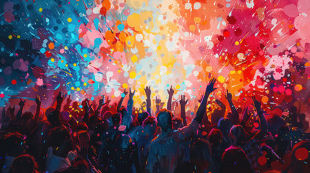 A crowded concert hall with scene stage green lights, rock show performance, with people silhouette, confetti explosion fired on dance floor air during a concert festival