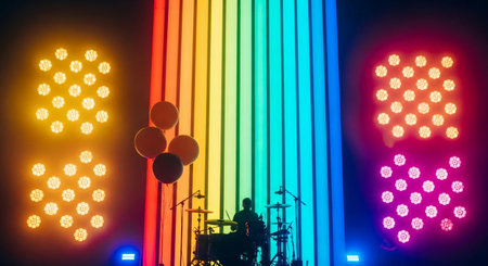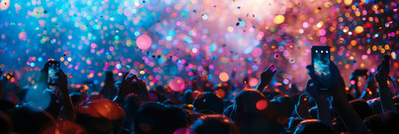 Audience members recording live performance on smartphones amidst colorful concert lighting and vibrant atmosphere