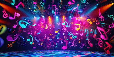 Colorful music notes on stage background. Music concept. 3D Rendering
