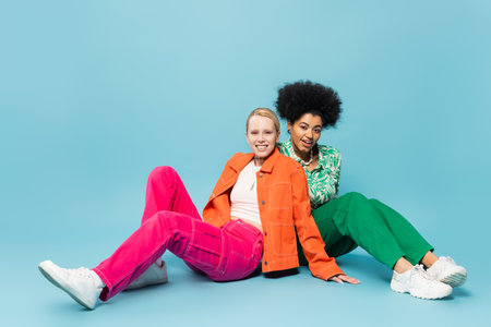 full length of blonde and brunette interracial women in bright and trendy attire sitting on blue background