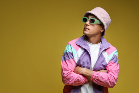 Fashionable portrait of handsome man in stylish outfit on olive background, space for text
