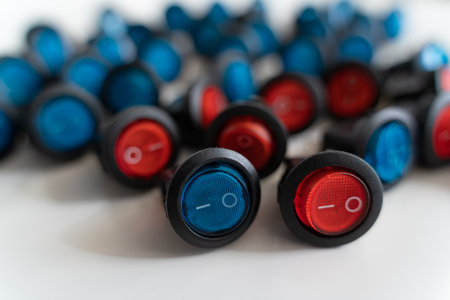 This stunning abstract image showcases illuminated light switches with a vibrant interplay of red and blue hues, perfect for modern design inspiration and creative projects.