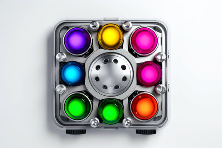 A close-up view of a high-tech control surface where vibrant, glowing buttons in a rainbow of colors await a users touch. This image evokes a sense of creativity, innovation, and control, perfect for concepts related to music production, gaming, or futuristic user interfaces.