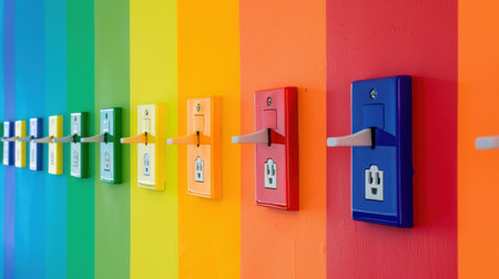 A stunning display of colorful light switches and power outlets arranged in a rainbow spectrum across a wall, perfect for modern interior design inspiration.