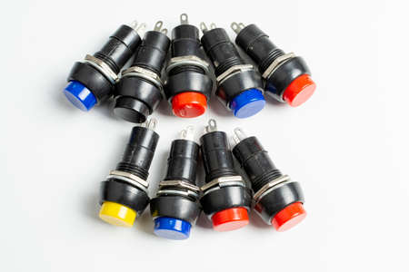 A vibrant collection of vintage buttons and switches arranged neatly in a grid, perfect for creative projects or visual inspiration showcasing nostalgia and colorful design elements.