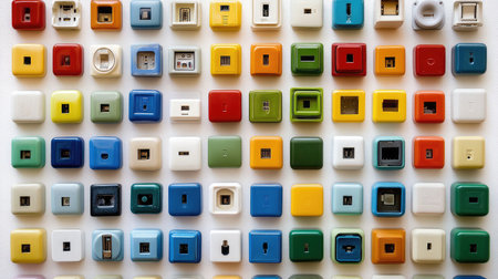 A vibrant and colorful wall featuring electric outlets in contrasting shades, ideal for modern interior design projects and creative spaces.