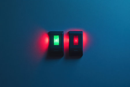 A close view of two light switches mounted on a wall. The green switch is illuminated, while the red switch shows an inactive status, creating a contrast in dim lighting.