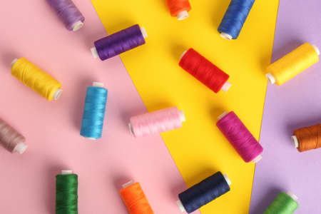 Top view of multi-colored sewing reels on a colored background. Hobby concept