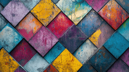 Close-up of grunge diamond tile pattern in vibrant retro colors, symbolizing vintage aesthetic. Concept of geometric textures and abstract design.