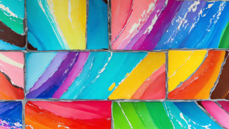 A colorful mosaic of tiles with a variety of colors and patterns. The tiles are arranged in a grid-like pattern, creating a visually interesting and dynamic composition. Scene is vibrant and lively