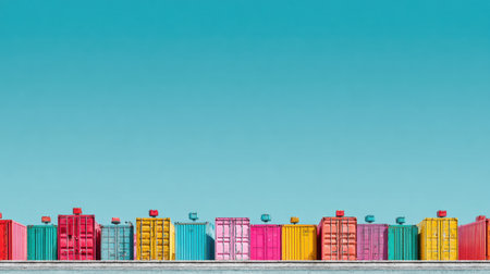 A striking image of brightly colored shipping containers stacked in an urban setting, creating a visually compelling pattern against a clear blue sky.