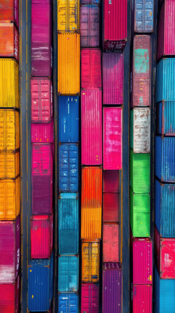 A vibrant display of shipping containers stacked in a container yard, showcasing the interplay of color and industrial structures while emphasizing logistics and transport.