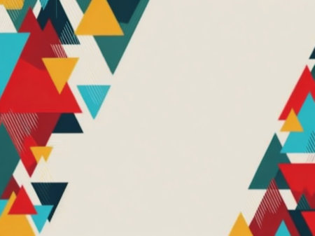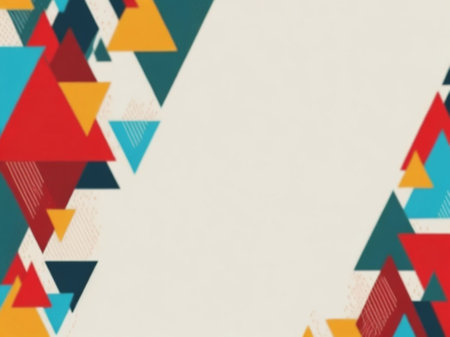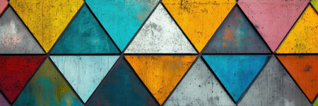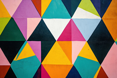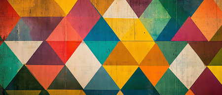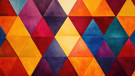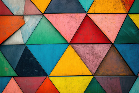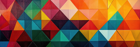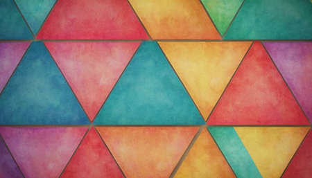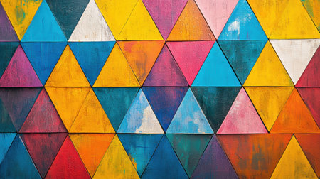 Vivid triangular patterns in various colors create a striking geometric abstract design on a textured background, enhancing visual interest.