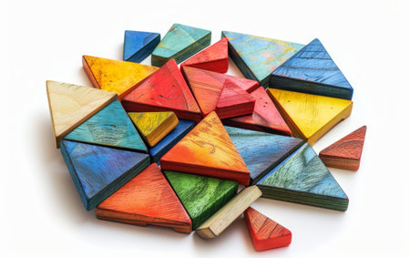 Assortment of vibrant, three-dimensional triangular shapes in various colors, scattered across a blue surface. The shapes have a geometric design.