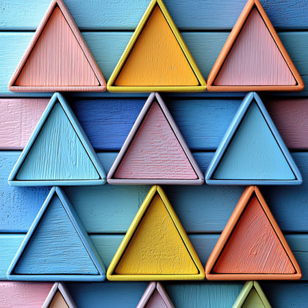 Vivid triangular shapes arranged in a geometric pattern create a striking visual against a textured surface, showcasing artistic expression.