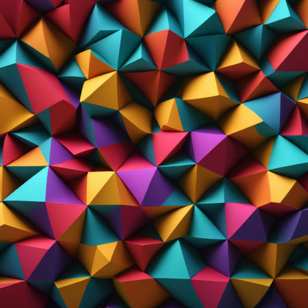 Vibrant geometric low poly pattern presenting dynamic abstract shapes with bright spectrum colors, forming eye catching textural background for modern graphic design