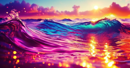 Waves crash and shimmer with sunset light, creating a magical atmosphere on the ocean.