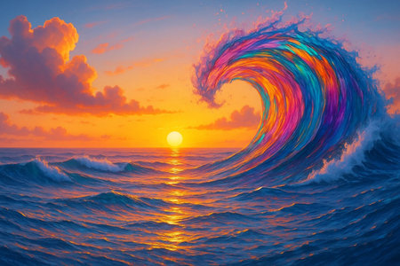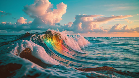 Waves roll across the ocean with bright colors, reflecting the beauty of nature under a cloudy sky.