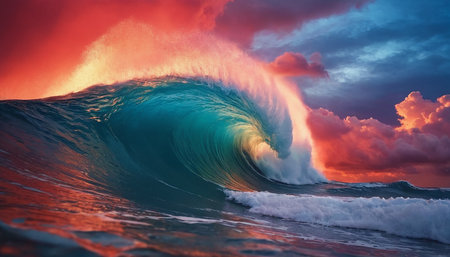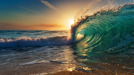dramatic wave crashing against the shore at sunset, with vibrant colors illuminating the sky and water, capturing the power and beauty of the ocean.