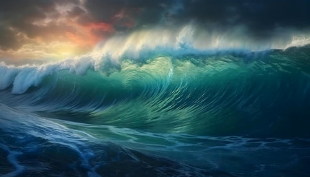 This captivating image showcases an ocean wave during sunrise, with the golden sunlight illuminating the vibrant colors of the water, creating a mesmerizing and tranquil scene that captures the beauty of nature and the power of the sea perfectly, AI generated image