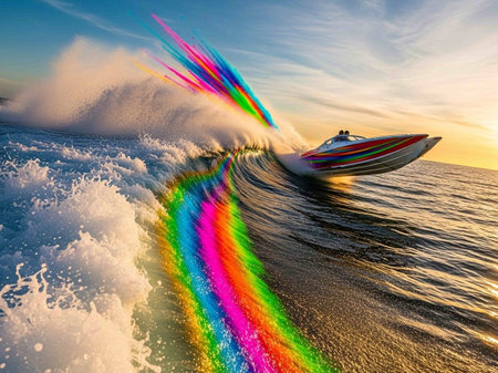 Speedboat on the sea at sunset. Multicolored rainbow.