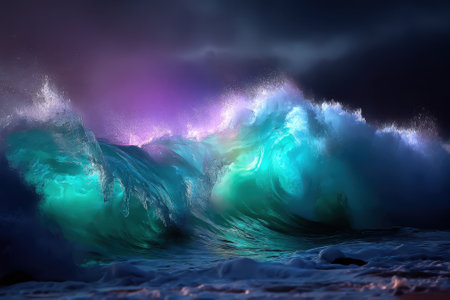 A breathtaking ocean wave crashes at night, radiating bright colors with shimmering reflections in the water.