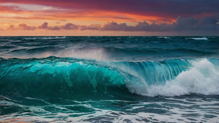 A serene ocean wave crashing at sunset with a vibrant sky