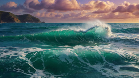 Bright waves crest against a calm sea at sunset, creating a stunning visual of nature's beauty and energy.